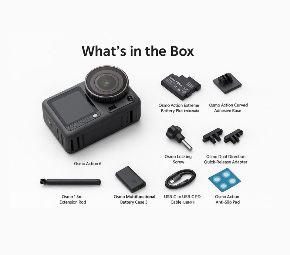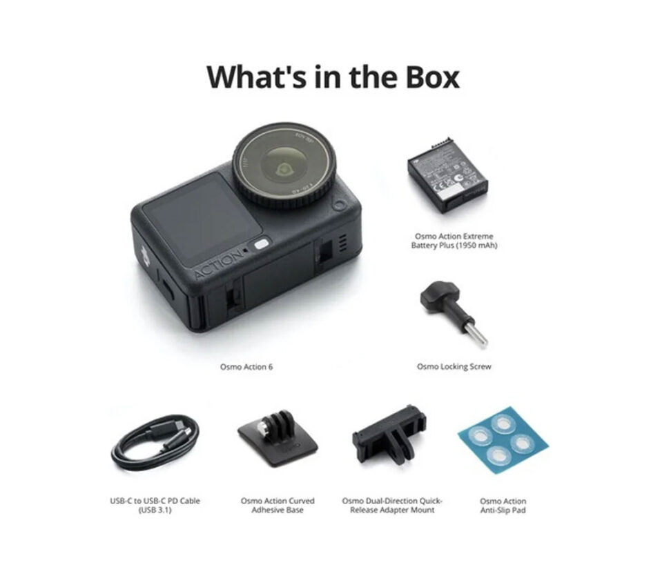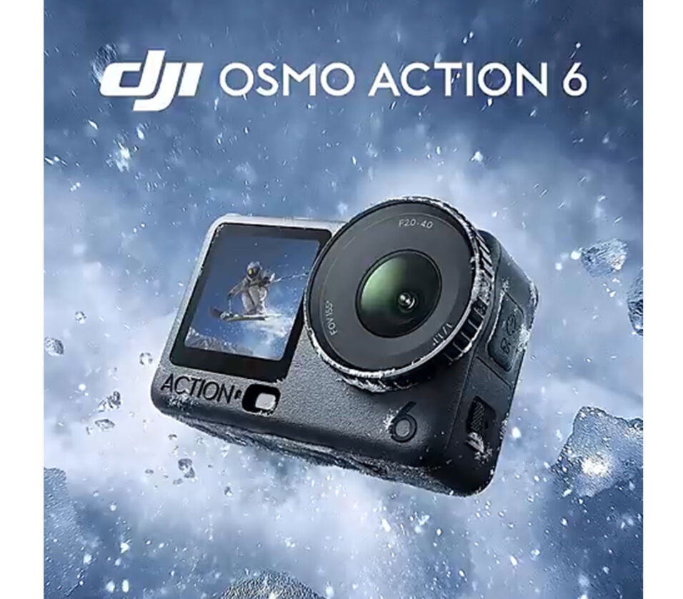 The Osmo Action 6 retains its bright dual OLED screens, RockSteady and HorizonSteady stabilization, 38MP sensor, 4-hour battery life, and waterproof body with water pressure gauge.