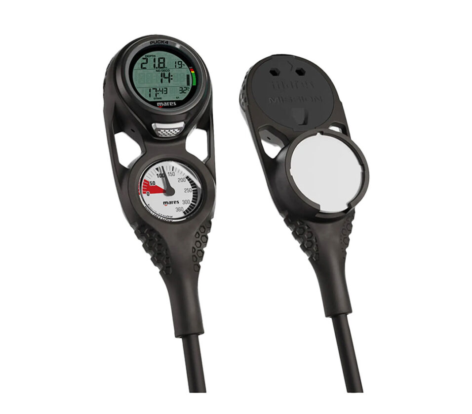 Enhance your dive kit with the Puck 4 Mission 3, a powerful combination of a dive computer and a pressure gauge in a sleek console. The Puck 4 features the Bühlmann ZH-L16C algorithm, a user-replaceable battery, Bluetooth connectivity and firmware updates via the Mares app. The pressure gauge boasts a brass case, a technopolymer window and intuitive color-coding for tank pressure. Choose the optional Compass Module for added navigation capabilities. The console, with a protective elastomer case, ensures durability and ease of use, with large attachment points and colored details for visibility.