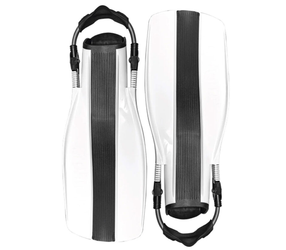 The blade shape is designed for a wide variety of kicks, including frog kicks, modified flutter and power kicks. They are stiff, yet with plenty of snap and are lighter in weight than traditional rubber fins, meaning legs and feet won't cramp even after miles of swimming. The 12-inch pliable marine grade stainless steel spring-heel strap allows for quick donning/doffing. A molded heel pad provides comfort, while low profile finger hold add to the ease of use without creating snag points.