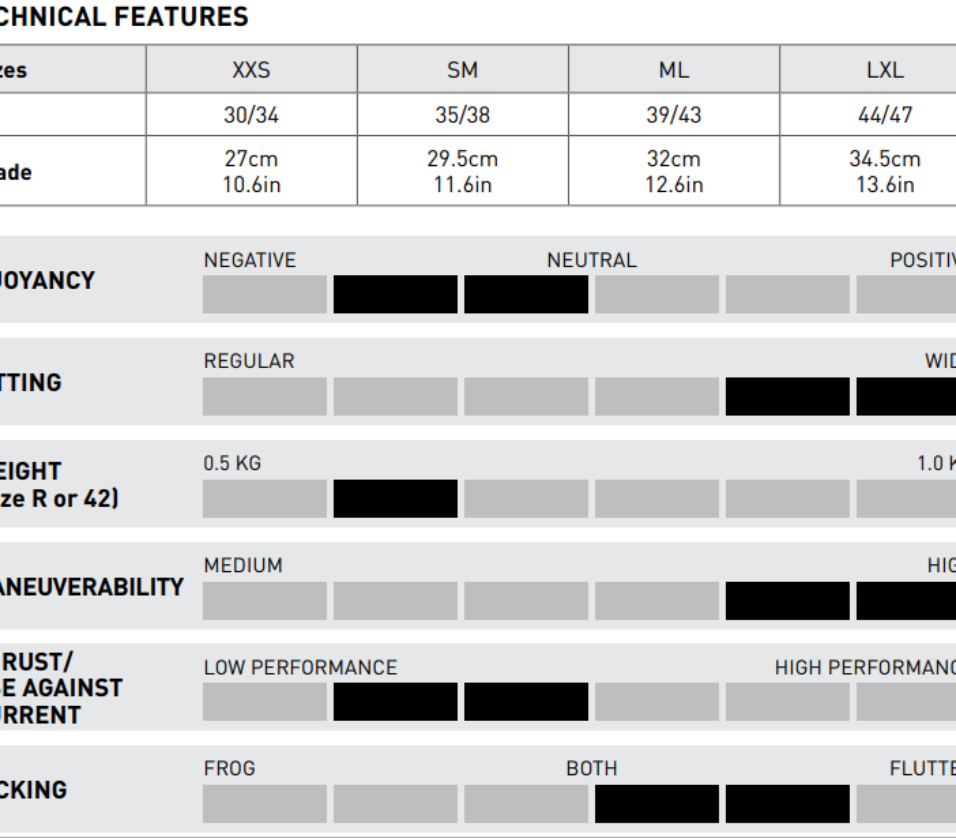 The Avanti Pure diving fins have a blade length ranging from 27 to 34.5 cm depending on the size. The fins have an open foot pocket and are made of bi-material.