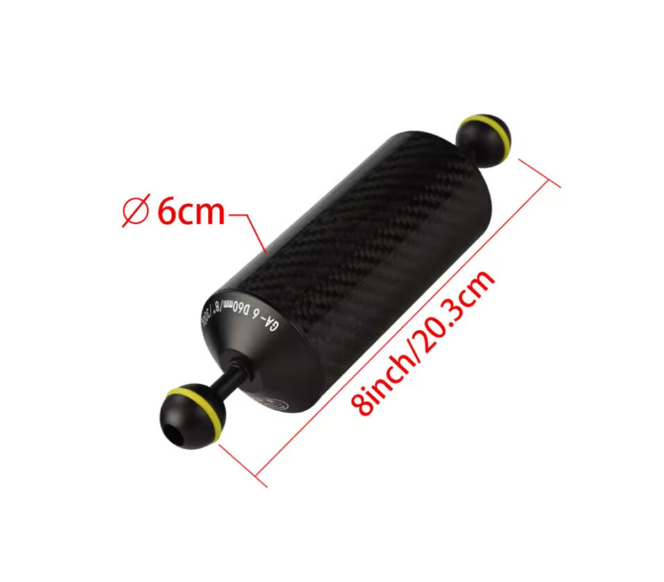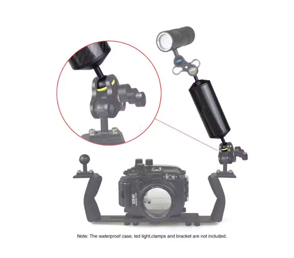 This arm is made out of CARBON FIBER which makes it super light for travel and very slick looking as well. Floating arm is typically used in scuba diving, to increase the buoyancy if you are carrying heavy gear. By attaching this arm to underwater photography equipment you can more easily manipulate your underwater housing and effortlessly take some magnificent photos and videos.