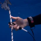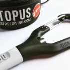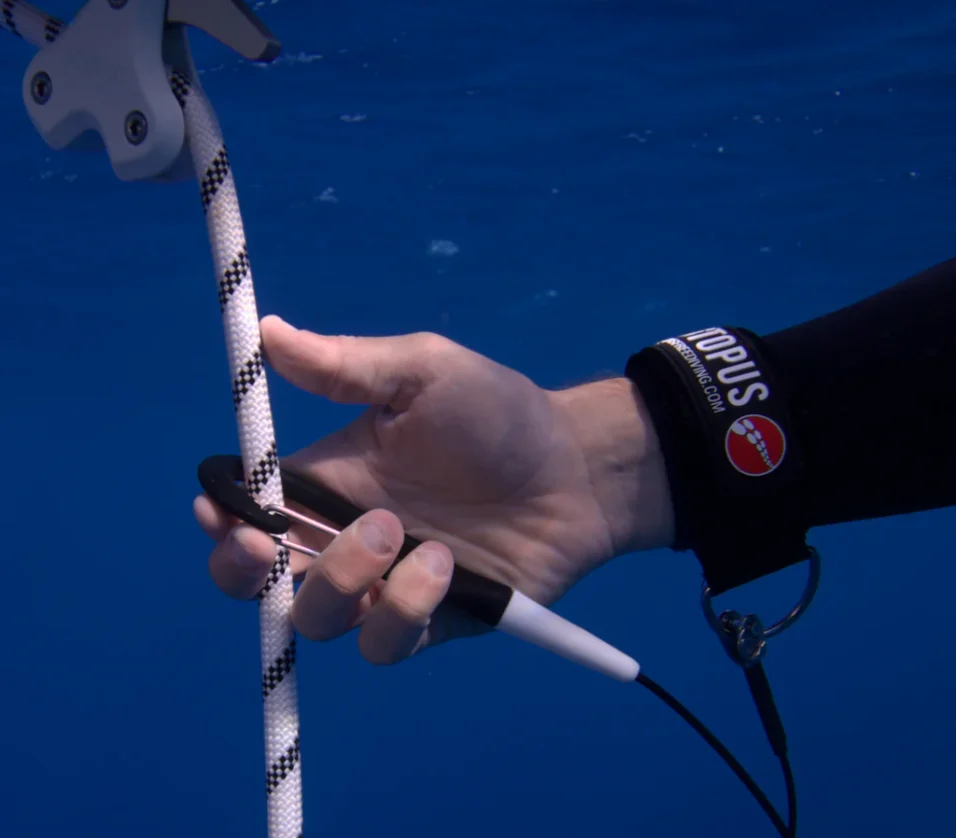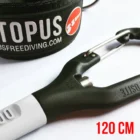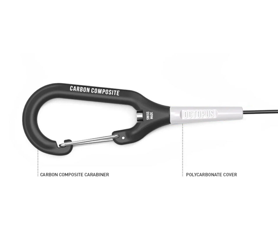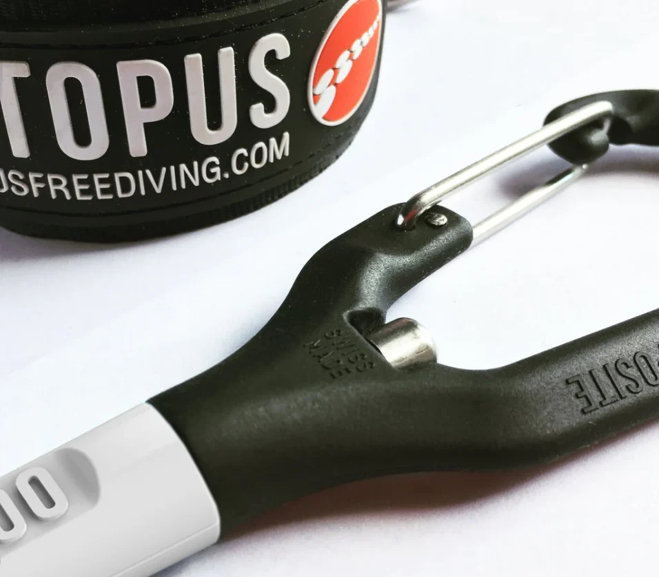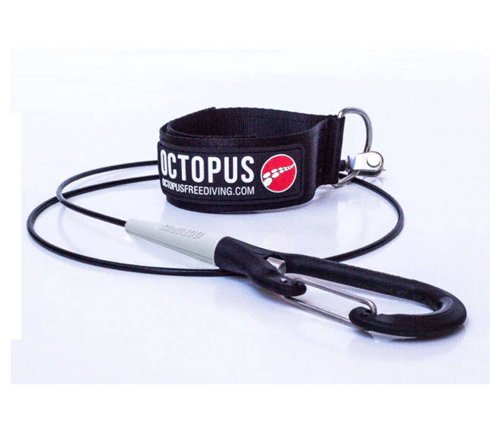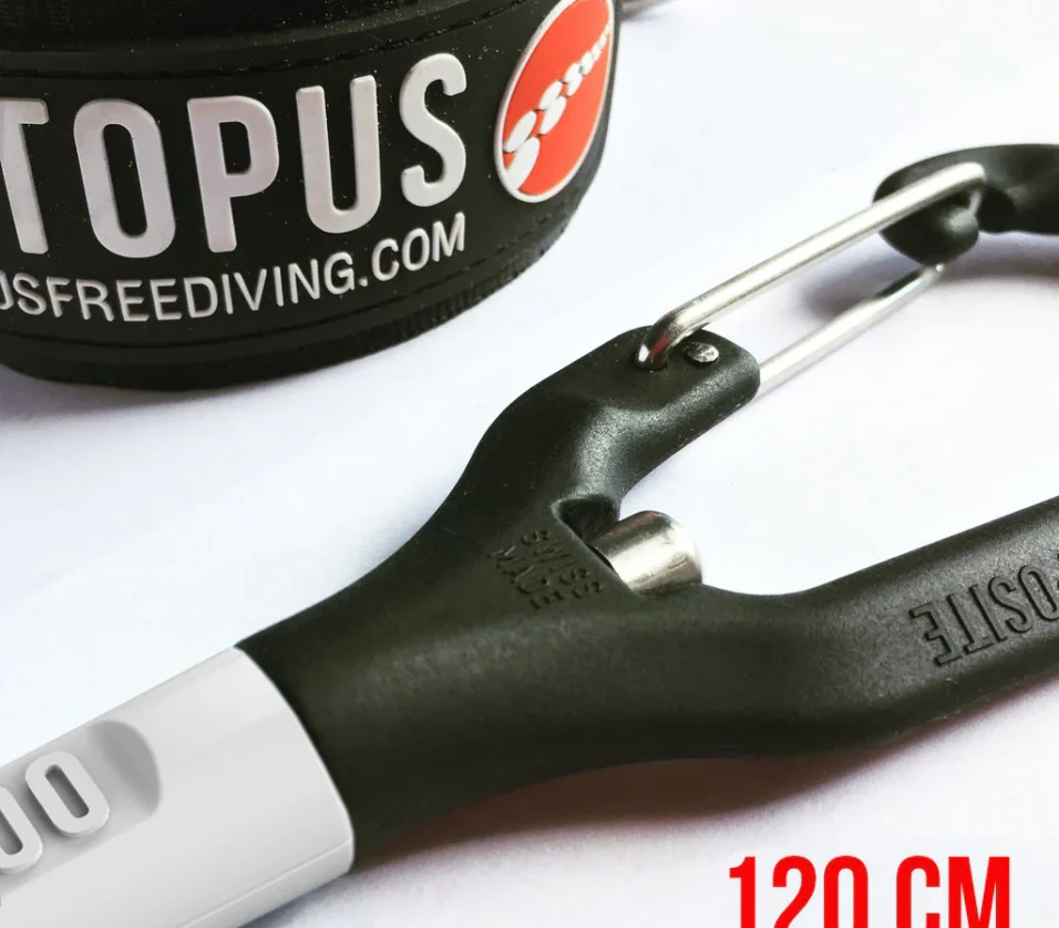 The Octopus lanyard: a mix of safety, efficiency and comfort. Made using only high-quality components, from the super-light carbon composite polymer carabiner, to the 120cm plastic-coated stainless steel cable, and the strong water-resistant marine-graded polyester velcro wristband. All components ensure a super-light and hydrodynamic lanyard, while remaining extra strong for your safety. The wristband also includes an innovative easy-grab tag, for added ease of quick-release use. Designed and tested by Swiss record-holder Pascal Berger (-131m VWT ). Made in Switzerland, for a quality you can trust.