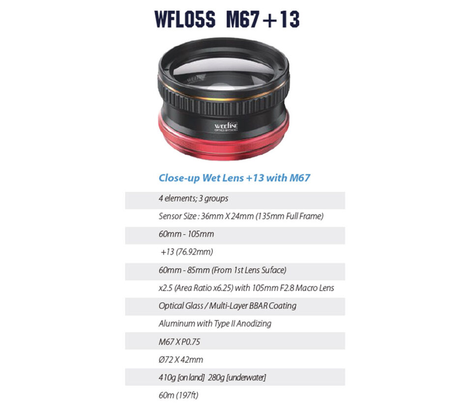 - Standard 67 mm Mounting Thread: The WFL05S Magnifier offers an industry-standard 67 mm thread. Screws directly onto many underwater housing ports!