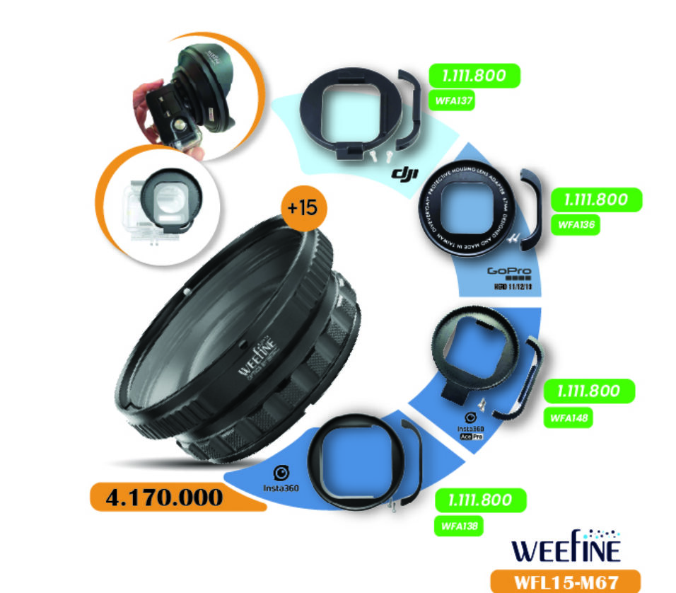 WEEFINE Diving Gear WFL15 is a premium underwater equipment close-up lens. Diving supplies comes with a +15 diopter (Air and Underwater) in optical power and allow the close-up shooting in a very short object distance.