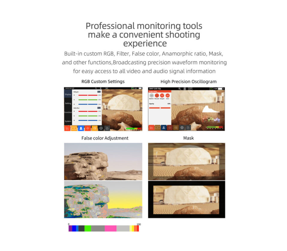 Monitor your 4K HDR video on the M5 5.5" 3D LUT 4K HDMI Touchscreen Monitor by Shimbol with its 1200 nit brightness, 1000:1 contrast ratio IPS screen with viewing angles up to 160 degrees, and built-in HLG mode and PQ support. The M5 monitor is calibrated to cover 100% of the Rec. 709 color space with a low Delta E of 0.6 for color accurate monitoring, supports resolutions up to DCI 4K25 or UHD 4K30, and features extensive monitoring tools such as 17- and 33-cube 3D LUT monitoring. The aluminum housing encloses a passively cooled design, which is possible due to its low power consumption of 3.5 to 6.5W, for a lightweight, quiet, and capable on-camera monitor.