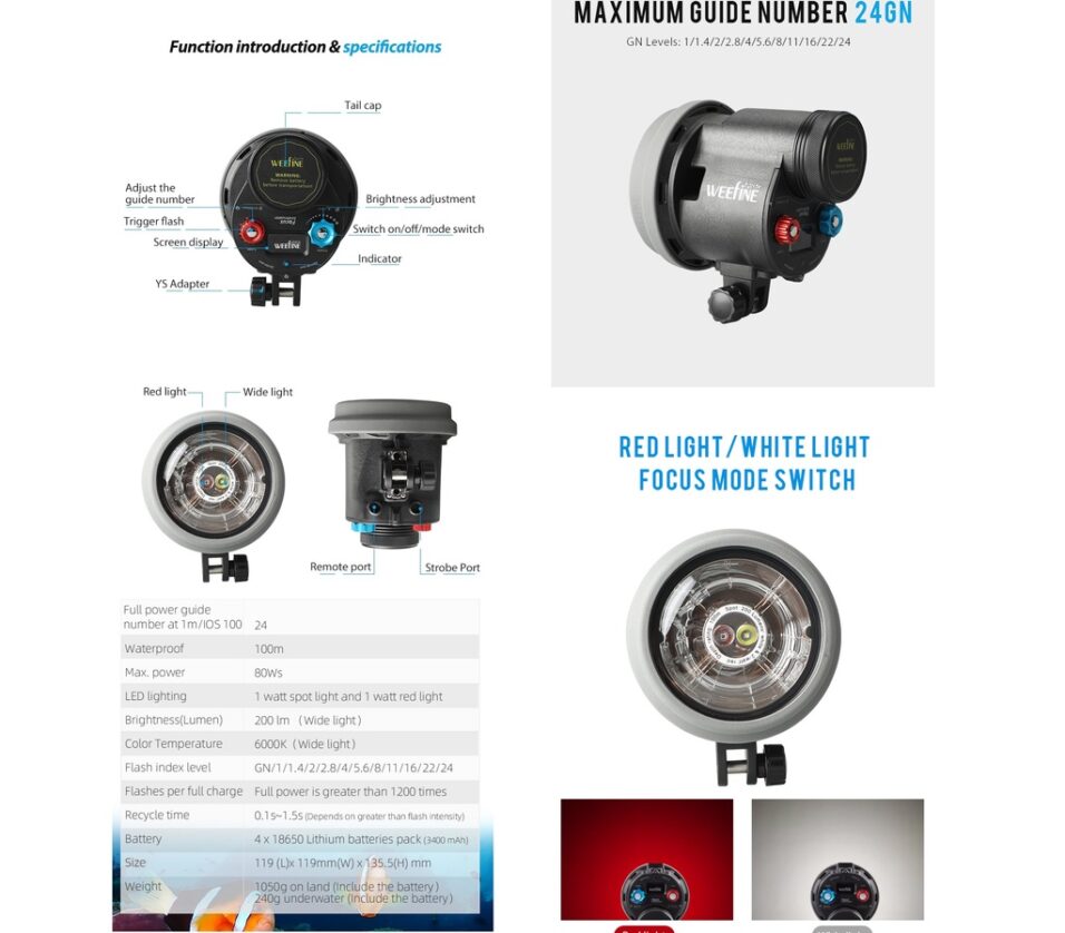 The Weefine WFS02 sets a new standard for underwater strobes, it can trigger over 1000 flashes with GN24 per battery charge.