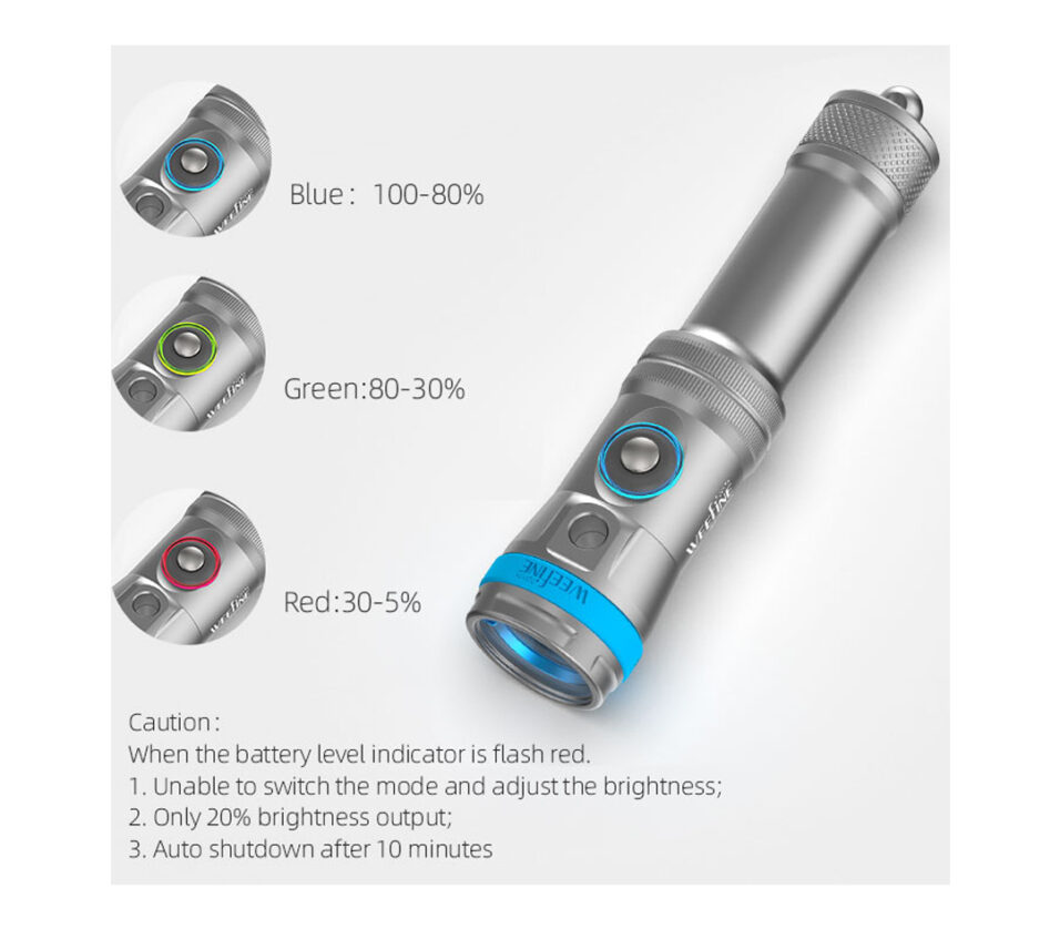 WF079 WEEFINE Diving Supplies Smart Focus 1200 is based on Diving Gear Smart Focus 1000 with WEEFINE brand full new design concept. The scuba gear of Smart Focus has the appearance with fashionable and tendency with 21700 battery, which utilizes black aluminum alloy housing with hard oxidation treatment and the brightness of the scuba equipment is up to 1200 lumens. Ring indicator is applied on the dive torch with stainless steel press button control. It is convenient the user to operate the diving equipment. The snorkeling gear has Auto shut-off function and strobe function with weefine brand new patent, which can satisfy the different needs of the user.