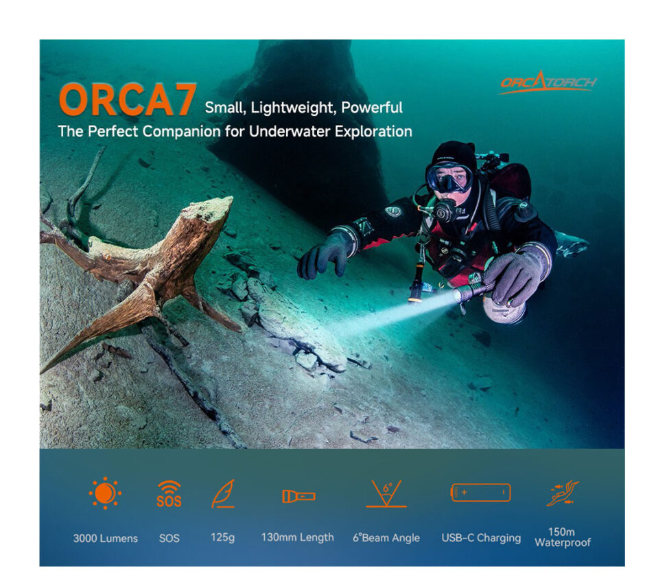 The ORCA7 is a professional-grade dive light, specifically designed for recreational diving, night diving, wreck diving, cave diving, etc. With a body length of just 141mm and weighing only 125g, it maintains a lightweight and portable form while offering excellent durability and corrosion resistance.