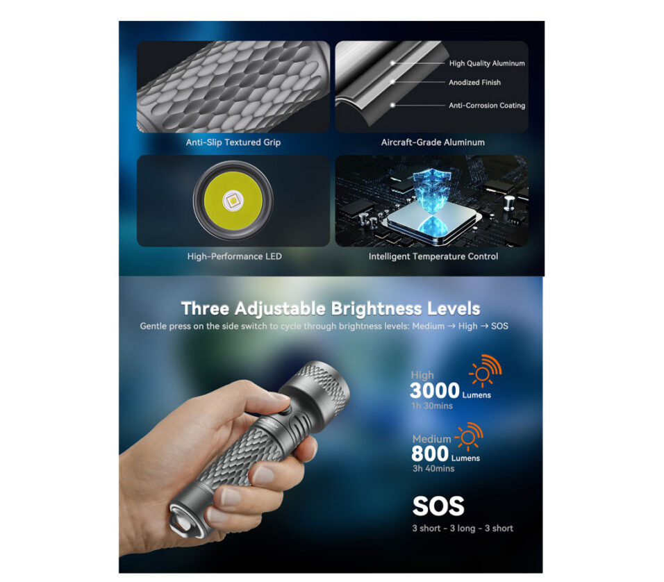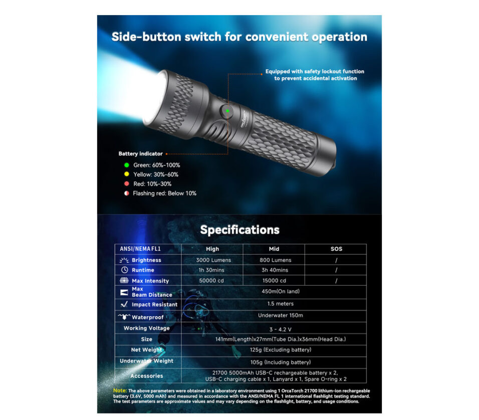 The ORCA7 is constructed from high-grade aluminum alloy and features hard anodization. This ensures a lightweight body (only 125g) while providing excellent impact resistance and seawater corrosion protection. Equipped with a high-performance LED, the ORCA7 delivers an impressive 3000 lumens of brightness. Whether for navigating murky waters, cave diving, or wreck diving, etc, it provides perfect illumination. The beam design balances a focused center spot (for long-range penetration) with a wider spill (for broad coverage), ensuring every moment underwater is clearly visible.