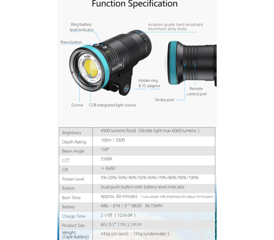• Durable and Reliable Construction : Constructed with a robust aluminum body, the Weefine Solar Flare 4500 is designed to withstand the rigors of deep-sea exploration. It's depth-rated to 100 meters, making it suitable for a wide range of diving environments, from shallow reefs to deep underwater caves. The durable construction ensures that the light remains reliable, even after repeated use in harsh conditions.