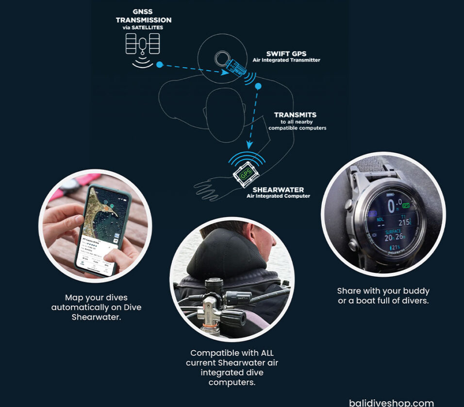 Every Shearwater air integrated dive computer can lock in your dive site location coordinates with the Swift GPS. Get more than the benefits of air integration when you capture your dive's entry and exit points, and add maps to your Dive Shearwater log. Receive real time gas pressure data and benefit from accurate gas time remaining calculations for extended dive time. Easily view all dive metrics in your computer display, maximizing your adventure and enjoyment underwater.Full Feature: