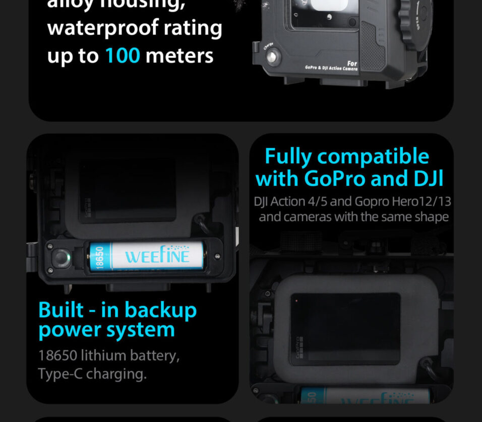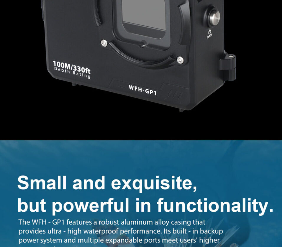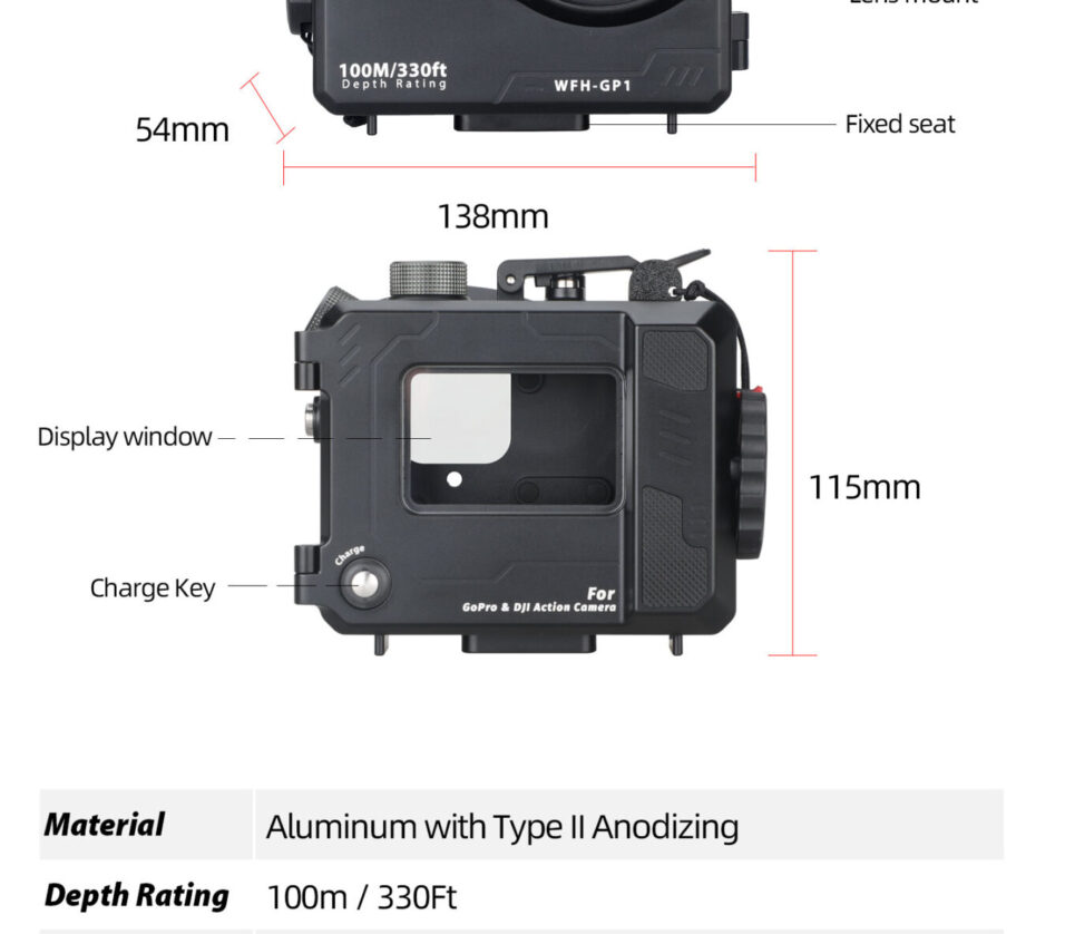 The Weefine WFH-GP1 Action Camera Dive Housing is a robust underwater enclosure designed to protect your action camera during aquatic adventures. Crafted from anodized aluminum, this housing ensures durability and resistance to corrosion, making it suitable for various diving conditions.