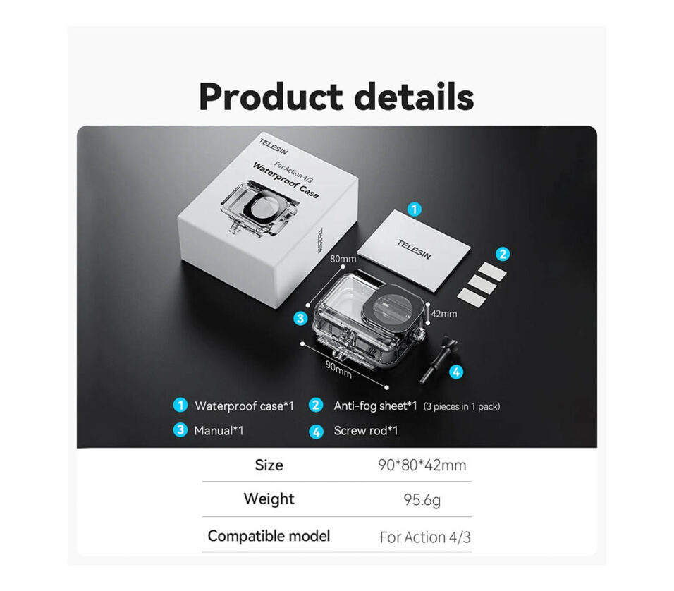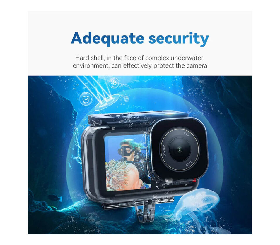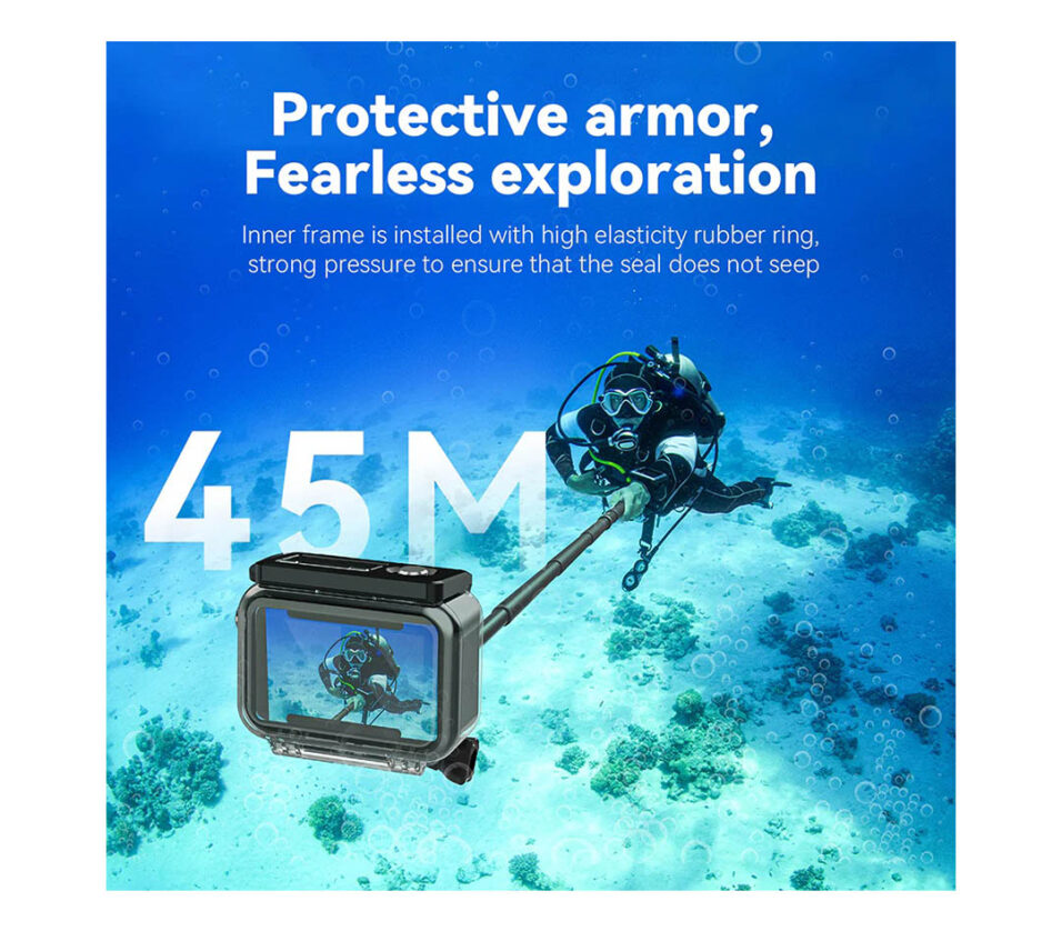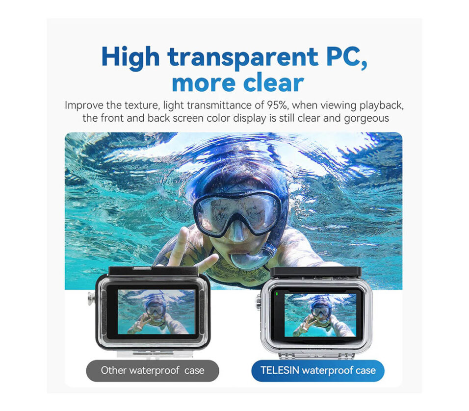 This casing is compatible for the DJI Action 3 4 5 camera. Waterproof, shockproof, and anti-fog are all fully owned by this casing. You can use it when doing water activities such as snorkeling, surfing, and diving. The recording results will look clear using the casing from Telesin.