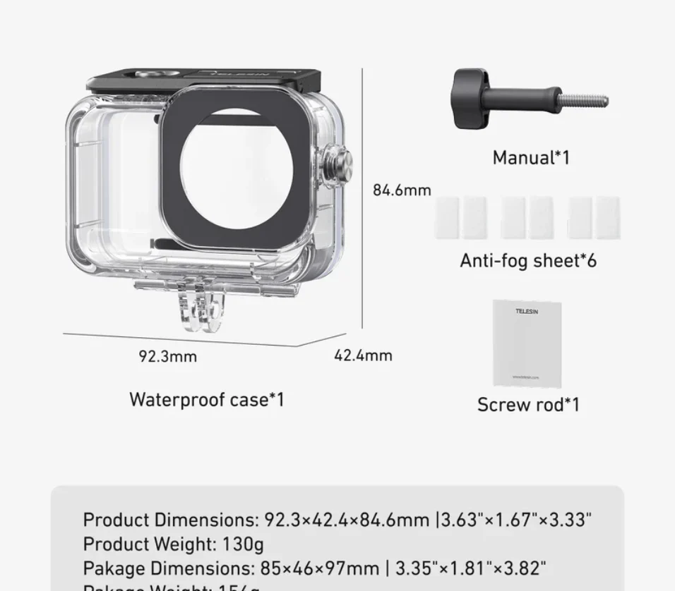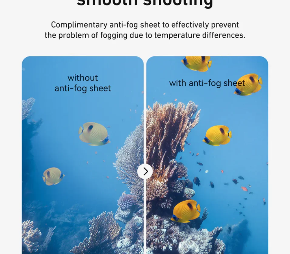 Anti-Fog Sheet: Included is an anti-fog sheet to prevent fogging from temperature differences, ensuring your lens stays clear throughout your adventure. Say goodbye to blurred footage!