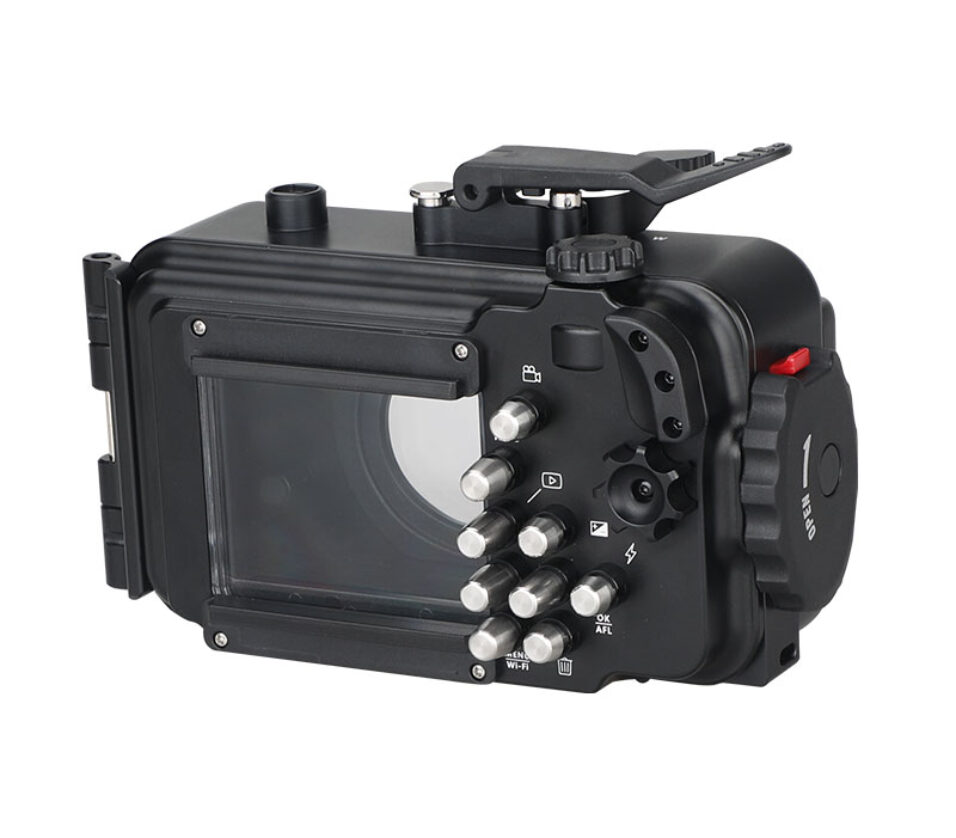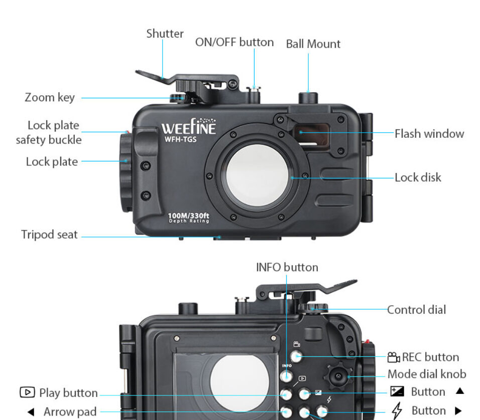Weefine high strength underwater housing, made of aluminum alloy shell. Because of this strong structure, this housing can be taken to a depth of 100 meters. It also has a rapid heat dissipation what eliminates condensation of the LCD window and lens.