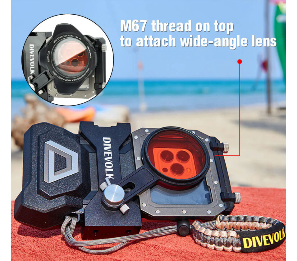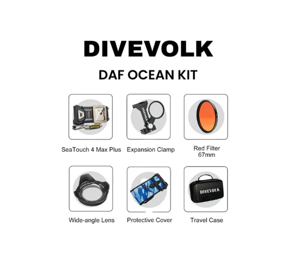 Divevolk DAF Seatouch 4 Max Plus - Ocean Kit FEATURES Underwater color restoration solution for sea water and expand of view with distortion correction by this filter and lens combo, simple to use but powerful in performance. Underwater full touchscreen housing to access all function on your phone Red filter.