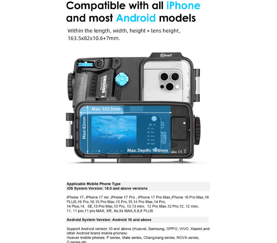 The Weefine WFH07X Universal Smartphone Housing is a precision-engineered underwater smartphone housing designed for divers who require reliability, functionality, and compatibility across various smartphone models. Constructed mainly from aluminum alloy, the housing provides durability and depth-rated protection for smartphones used in challenging underwater conditions.