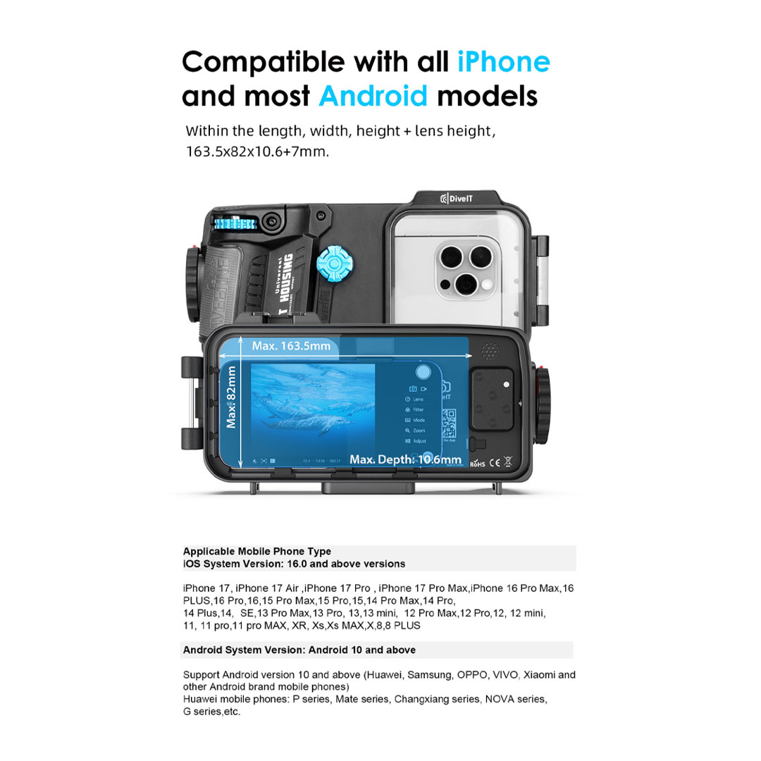 The Weefine WFH07X Universal Smartphone Housing is a precision-engineered underwater smartphone housing designed for divers who require reliability, functionality, and compatibility across various smartphone models. Constructed mainly from aluminum alloy, the housing provides durability and depth-rated protection for smartphones used in challenging underwater conditions.