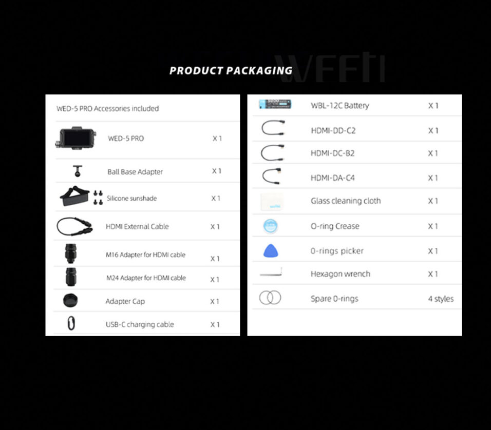 The Weefine WED-5 PRO Underwater Monitor is a professional-grade underwater monitor developed in collaboration with experienced underwater photographers. Designed for use in extreme marine environments, this Weefine monitor combines a compact form factor with advanced imaging tools that meet the needs of both videographers and photographers.Underwater Monitor Weefine WED 5 Pro