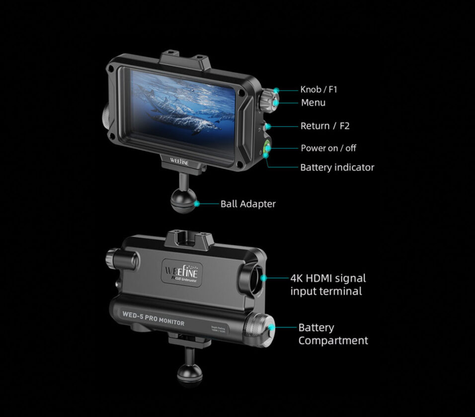 The Weefine WED-5 PRO Underwater Monitor is a professional-grade underwater monitor developed in collaboration with experienced underwater photographers. Designed for use in extreme marine environments, this Weefine monitor combines a compact form factor with advanced imaging tools that meet the needs of both videographers and photographers. Engineered for underwater applications, the Weefine WED-5 delivers clear, accurate visuals in challenging lighting conditions. Its 5-inch A-grade HD LCD panel features 1920×1080 resolution, 443 PPI pixel density, and the Rec.709 color gamut, providing exceptional color accuracy for monitoring your footage in real time. With 3,200 nits of ultra-high brightness and patented auto-backlight adjustment, it remains visible even in direct sunlight underwater, improving focus and framing accuracy during dives.Key Features of the Weefine WED-5 PRO