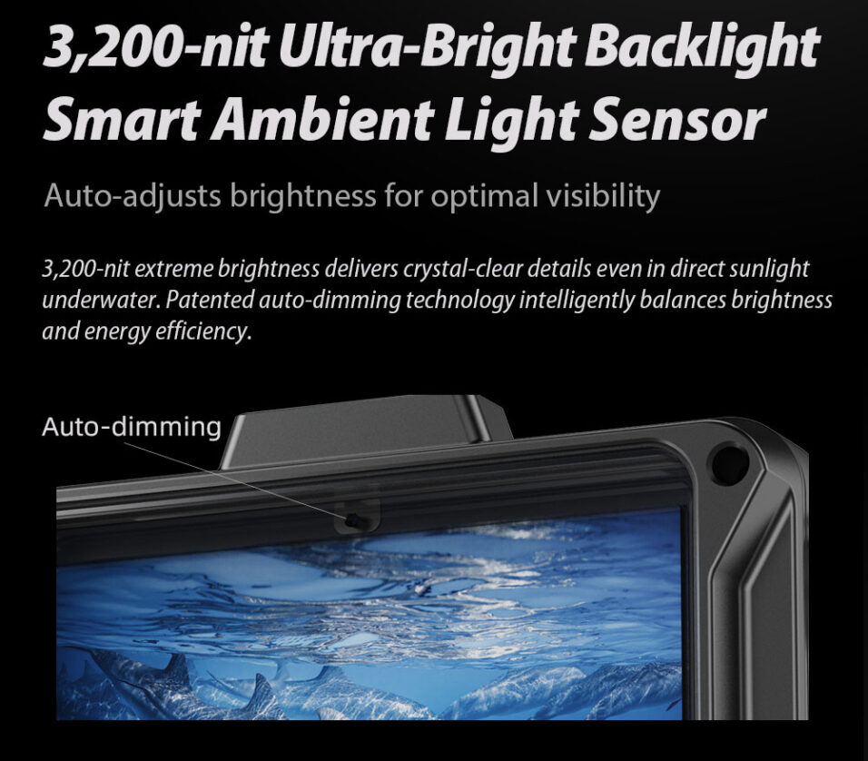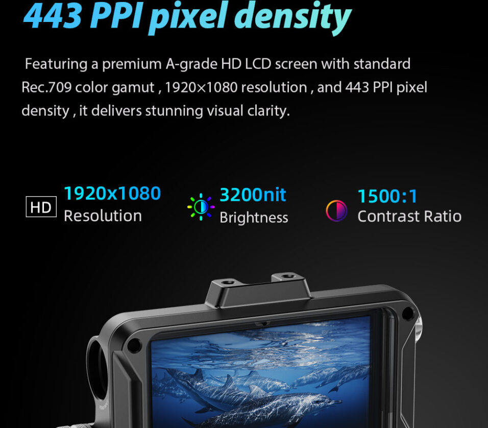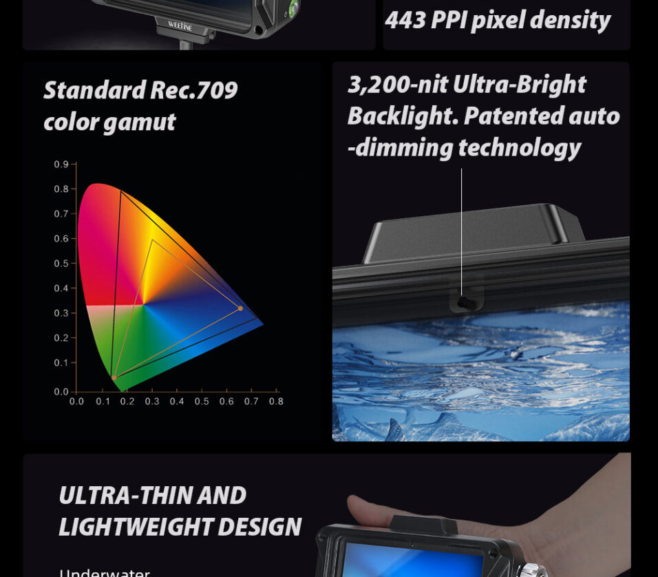 Engineered for underwater applications, the Weefine WED-5 delivers clear, accurate visuals in challenging lighting conditions. Its 5-inch A-grade HD LCD panel features 1920×1080 resolution, 443 PPI pixel density, and the Rec.709 color gamut, providing exceptional color accuracy for monitoring your footage in real time. With 3,200 nits of ultra-high brightness and patented auto-backlight adjustment, it remains visible even in direct sunlight underwater, improving focus and framing accuracy during dives.