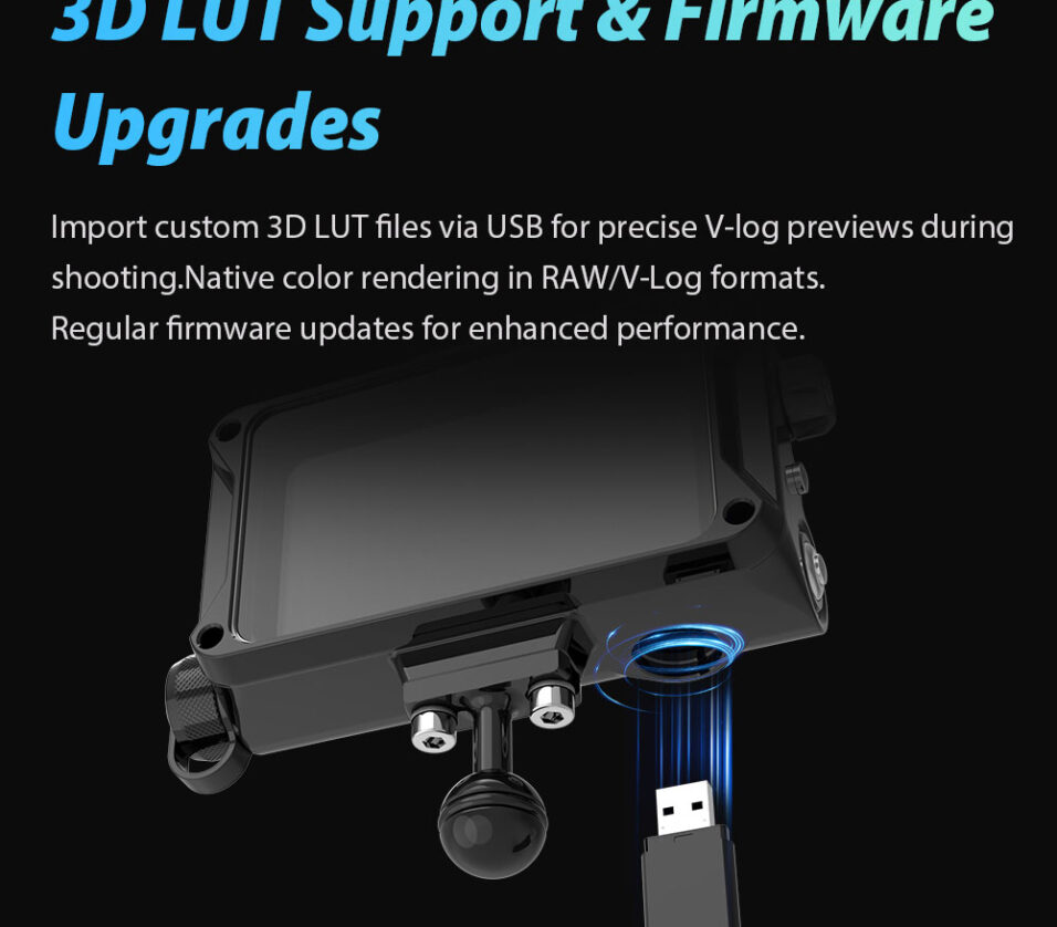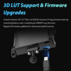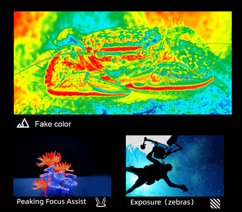 - Focus & Exposure Tools: 3D-LUT, peaking focus, false color, waveform, brightness histogram, safety markers