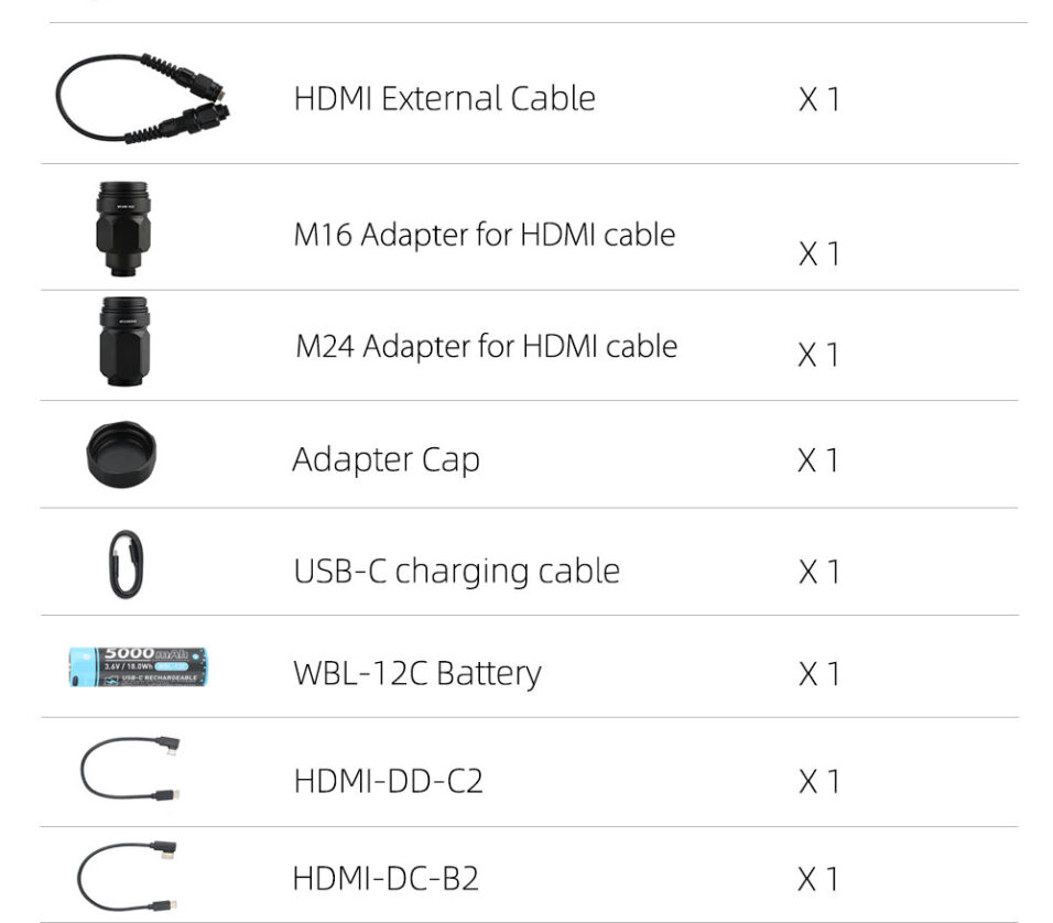 - Connectivity: HDMI 2.0 Type A/C/D cables included, M24/M16 waterproof adapters
