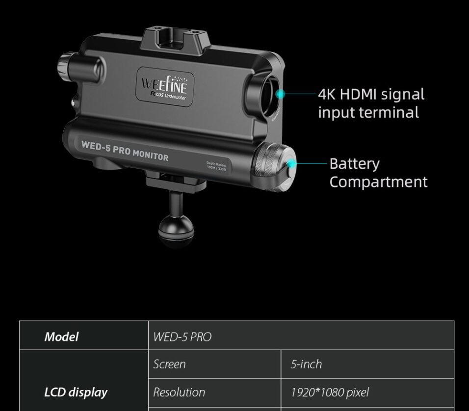 The Weefine WED-5 PRO Underwater Monitor is a professional-grade underwater monitor developed in collaboration with experienced underwater photographers. Designed for use in extreme marine environments, this Weefine monitor combines a compact form factor with advanced imaging tools that meet the needs of both videographers and photographers.