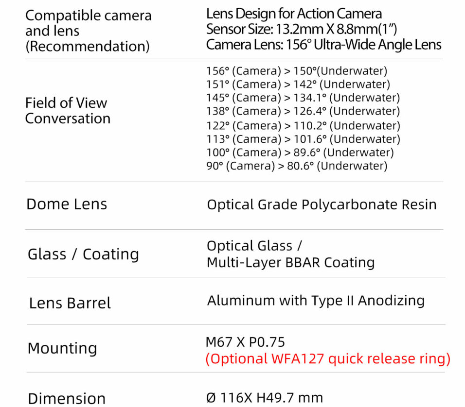 • Compatible camera and lens: Sensor Size: 13.2mm X 8.8mm(1") Camera Lens: 150° Ultra-Wide Angle Lens