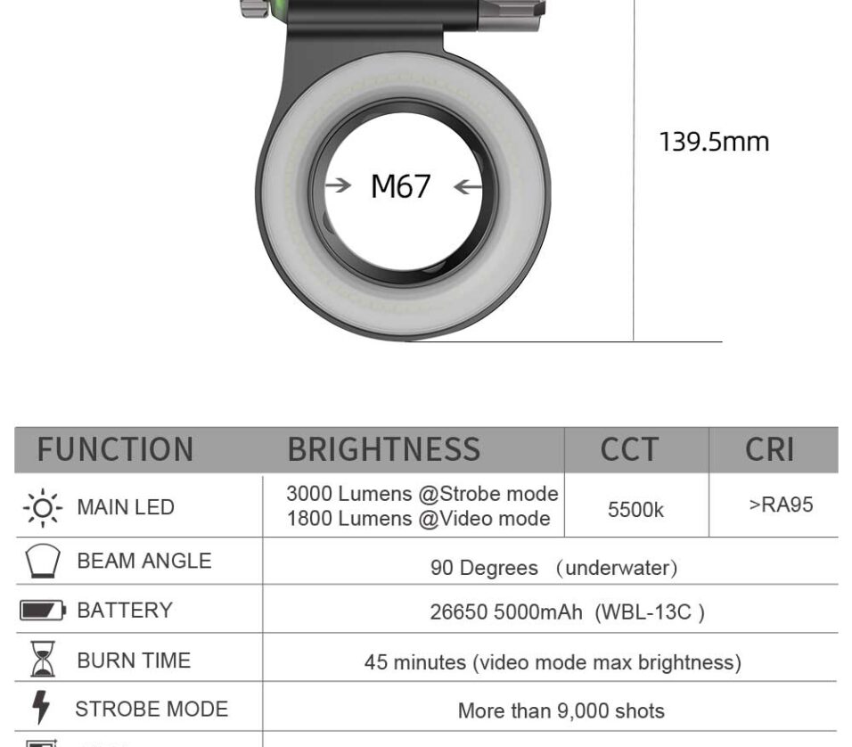 Delivering up to 3000 lumens of daylight-balanced light (5500K) with exceptional color accuracy (CRI 90), it offers reliable illumination even in the most challenging aquatic environments. Designed for divers, underwater photographers, and content creators, this versatile ring light includes RGB color options, a robust depth rating of 100 meters, and supports both flash trigger and focus functions—solving the common problem of inadequate lighting in macro or close-up underwater scenarios. Its M67 x P0.75 screw thread design allows direct attachment to underwater camera ports or lenses.