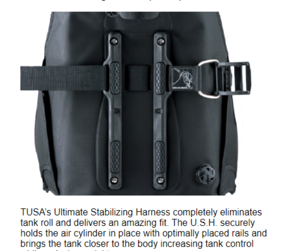 The Ultimate Stabilizing Harness (U.S.H.) eliminates tank roll and provides a fantastic fit, securely holding the air cylinder in place with rails, bringing the tank closer to the body, and increasing tank control while reducing weight.